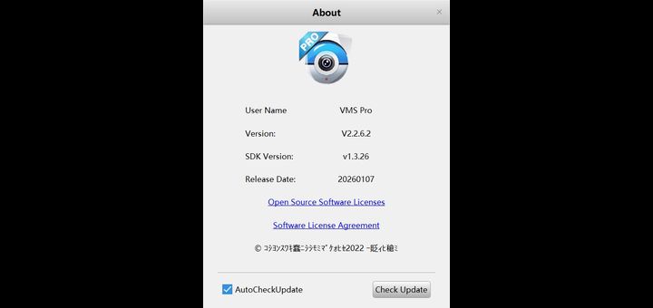 クラウド対応VMS Pro ソフトはVer1.xは日本語対応していましたが、2024年のVer2.xからベトナム、インドネシアなど多言語が追加され逆に日本語は削除されてしまいました、販売シェアか翻訳難易度なのか判りませんが現行V2.2.4.3でも追加される様子はなく、追加されたクラウド関連、新型カメラの操作が英語環境では直感的に操作できず扱い辛くなりましたので当店独自の日本語化データを作成いたしました。