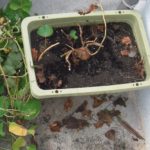 種芋ごと定植した最後のプランターなので期待はしていませんが、このままでは邪魔なので掘り返します。