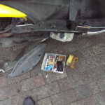 「漏れがあまりにもひどすぎる!」ラジエターは破損していない、エンジンは冷えているので圧が無からパッキンからの漏れではないラジエターホースも同じ、なによりウォーターポンプがこれほどの水量を送れる訳ない、という事はラジエターより低い所にあるサブタンク辺りが原因と推察….にしても暑いし駐輪場みたいな所に駐輪していたので周りの目が厳しい(路上に緑色のシミを作っていたら私も見る)のでよろよろバイクを押して丁度良い遊歩道的な街路樹が影を落としている所を見つけて修理開始。(本来はバイク屋に駆け込む事をお勧めします)