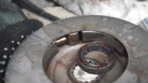 3年の使用で赤黒い汚れが付き放題になっています、仕組みは「遠心力がない時は小さい横向きの円柱が縦の円柱を突き上げて右側に寄る→幅が狭まりクランクシャフトとセルモーターがリングギアと介して繋がりる」「遠心力が加わる縦の円柱が左に寄る→繋がらずフリーになる」文字通りセルモータからクランクシャフトへのone way( 一方通行)なクラッチです。動力は遠心力のみで自動車の様なピニオンギアがないシンプルコンパクトで良くできた仕組みです。