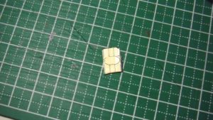 一気に切るのではなく、先ほど引いた線にものさしでカッターの刃を誘導し何回も往復させてゆっくり切り取ります(ディスクカッターとかペーパーカッターがあればさらに簡単)金属面に触れて静電気で壊したりしないようセロテープはそのままにして、SIMトレイにすっぽり収まる様に紙やすりで修正します。