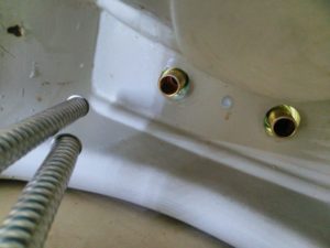 どうせ交換するなら接続パイプ付きを買っておけばよかったと後悔しましたがフレキパイプが接続出来ないとどうにもなりませんから、近所のホームセンターへ走り450㎜のフレキパイプ(480円)を2本購入、付属プラ製固定ナットを使用せず旧水栓の薄い金属ナットを使用して水栓を固定する事に変更。