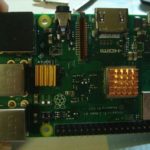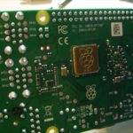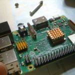 箱から取り出したRaspberry Pi 3 Model B+にキット付属のヒートシンクを貼り付けます、チップサイズとヒートシンクのサイズが同じですから間違える事は無いでしょう、薄いヒートシンクは裏側になります。