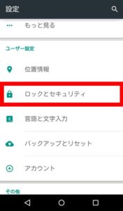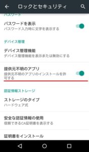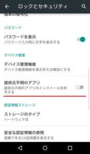 ④ロックとセキュリティ画面に移行します、下方に「提供不明のアプリ」の項目がありますので右側のスライドスイッチ又はチェックボックスをONにします。
