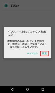 ③タップすると「インストールはブロックされました」のダイアログが表示された場合は「設定」の文字をタップします。(表示されない方はそのままインストールして下さい)