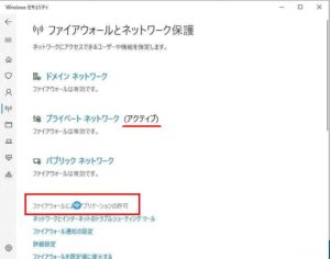パソコンが「ドメインネットワーク」「プライベートネットワーク」「パブリックネットワーク」のいずれかが「(アクティブ)」になっているか確認して「ファイヤーウォールによるアプリケーションの許可」をクリック。