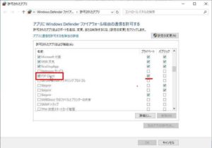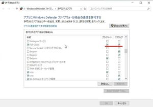「P2P Client(HiP2P Clientソフトの事)」右欄の プライベート パブリック が先ほど確認した「(アクティブ)」のネットワーク(「ドメインネットワーク」「プライベートネットワーク」「パブリックネットワーク」)で☑されているか確認します。
