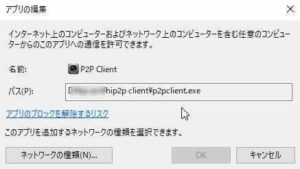 「P2P Client」ソフトを複数インストールしている場合や、重複インストールした場合は「P2P Client」が複数表示されます、許可したいP2P Clientが現在使用している・許可したい物なのかわからない場合は「P2P Client」をクリックしてパスで確認して下さい。