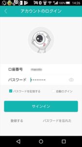 それぞれの欄に入力して 登録する ボタンをタップします。 始めのアカウントのログイン画面に戻ります、先ほど作成したアカウントの口座番号(口座番号はユーザー名の事)とパスワードをそれぞれ入力し サインインボタンをタップします。