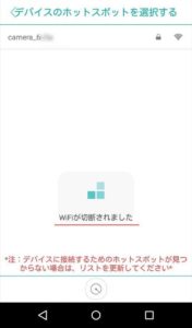スマホのWifi接続先がカメラのAPアクセスポイントに自動的に切り替わり、「Wifiが切断されました」と表示されますが慌てずそのまま放置してください。