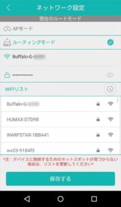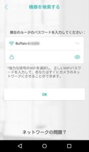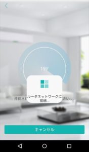 レーダーがクルクル回る検索画面に切り替わります「ルーターネットワークに接続…」の文字が表示されカメラAPを自宅・会社のWIFIへ書き換え、スマホの接続先も自動的に切り替わります。(カメラ機種や環境により少し時間が掛かります)