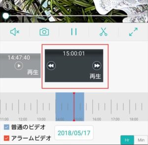タイムスライダーや時間単位アイコンをドラッグし録画時間を目安にして目的の録画データを探し出し、時間単位アイコンを長押し(ロングタップ)します。