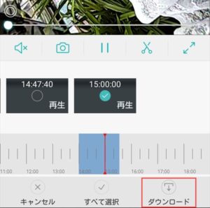 時間単位アイコンに☑が入ると、下部のメニューが切り替わり、「キャンセル」「すべて選択」「ダウンロード」アイコンが表示されます、ダウンロードをタップします。
