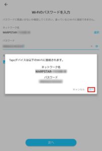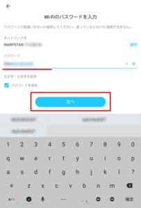 wifi パスワード が正確に入力されているか確認します 入力ミスするとカメラをリセットして最初からやり直す事になりますので右の目アイコンをタップして正確に入力して 次へ をタップします。
