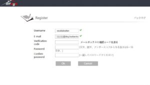 Register 画面になります、Username、E-mail、Password、Confirm password の各欄に入力します、誤入力があると赤文字が表示され正規入力の場合は緑☑になります。